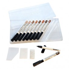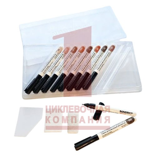 Novoryt P10 - Набор Вентильных фломастеров - 10 цветов (71, 302, 814, 808, 13, 30, 19, 29, 860, 871) Только лессирующие цвета (прозрачные древесные цвета, красящий состав по типу прозрачной морилки). Простые в использовании фломастеры для дорисовки текстуры и детального восстановления рисунка поверхности после заделки шпатлёвками. Фломастеры готовы к применению. Для пробных выкрасов используйте листы белой бумаги. Тонкий рабочий стержень (НЕ сменный). Для нанесения особо тонких штрихов немного обсушите рабочий стержень фломастера об безворосвую салфетку и оттяните фломастер максимально от поверхности, наносите штрихи только самым кончиком стержня. Ретуширующими фломастерами Новорит можно работать на любых заделках с использованием Мягкого воска, Шпатлёвки-расплава или Стержней Новорит. Ремонтные места, заделанные мягким воском, при необходимости (более чёткие линии), можно предварительно слегка лакировать лаком-спреем и подшлифовать нетканым шлиф. волокном К 600 серое. ВНИМАНИЕ: Частая дорисовка по лаку и/или воску может забить рабочий стержень. Рекомендуется регулярная очистка стержня. Восстановление (дорисовка) текстуры древесины проводится тонкими штрихами с растушёвкой вдоль текстуры. После дорисовки текстуры не рекомендуется шлифовать. Место заделки с дорисовкой текстуры или восстановлением цвета рекомендуется защищать Фиксирующим лаком Новорит нужной степени блеска (поставляется отдельно). Набор ретуширующих фломастеров отлично дополнит ремонтные наборы и Сервисные чемоданчики и крайне необходимы для полноценного локального ремонта поверхностей. При необходимости допускается заправка тонких фломастеров оригинальными ретуширующим составами Новорит соответствующего цвета (не более 3-5 раз). Не рекомендуется сильно давить на стержень, это приводит к его деформации и фломастером будет невозможно наносить тонкие штрихи и линии. При необходимости стержень можно аккуратно чистить с помощью разбавитель V15 и безворсовой салфетки.Комплектация - 1 ПЭТ-коробка -10 тонких фломастеров (разные цвета) - листы для проб