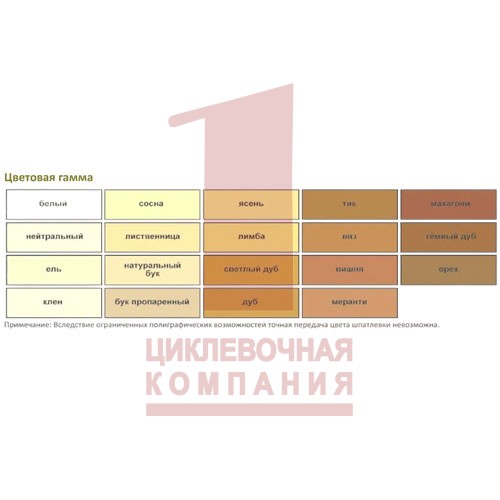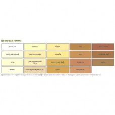 19 цветов: белый, нейтральный, ель, клен, сосна, лиственница, бук натуралный, бук пропаренный, ясень, лимба, дуб светлый, дуб, тик, вяз, вишня, меранти, махагон, дуб темный, орех.