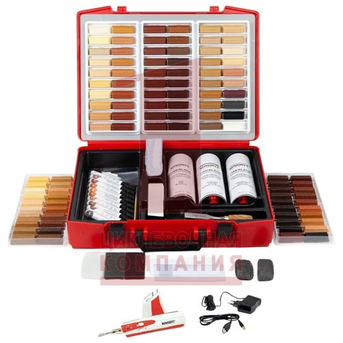 Сервисный чемоданчик А (комплектация WW40-HW60-Ak) 1 пластмассовый чемоданчик размером 464x354x108 мм 40 брусков мягкого воска Новорит в ПЭТ-коробках 60 брусков шпатлевки-расплава Новорит в тройном поддоне 10 вентильных ретуширующих фломастеров в ПЭТ-коробке 10 сменных стержней для фломастеров, 1 тонкая кисточка 5 листов ткани, 5 пластиков для смешивания, 5 листов для проб 1 аккумуляторный воскоплавитель с кабелем от сети 220В 1 запасная игла для воскоплавителя, 1 кабель USB 3 флакона фиксирующего лака с 3 запасными форсунками 1 стамеска, 1 универсальный шпатель с гребенчатыми резцами 1 цикля,, 5 шлифовальных материалов
