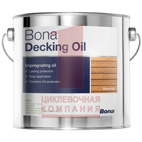 Bona Decking Oil - концентрированная смесь на основе натуральных растительных масел, модифицированных для долговременной пропитки и защиты террасной доски и других наружных деревянных конструкций. Хорошо подчёркивает естественную красоту древесины, выделяя её текстуру и придавая мягкий матовый оттенок. Bona Decking Oil хорошо защищает дерево от влаги, уменьшает потенциал древесины к растрескиванию и короблению.
